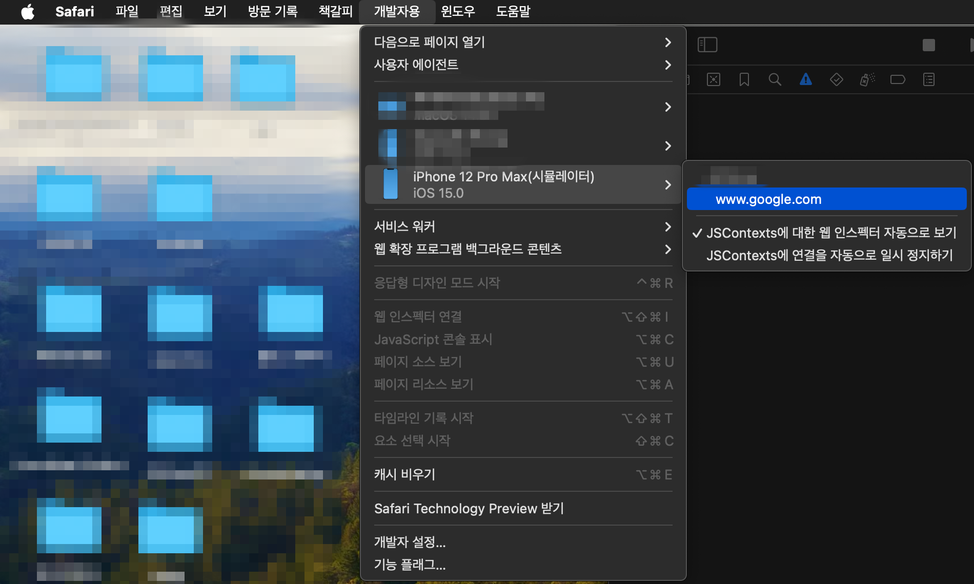 3. 시뮬레이터에서 웹뷰로 이동 후 -> 사파리 -> 개발자용 -> 원하는 시뮬레이터에서 현재 웹 주소 선택