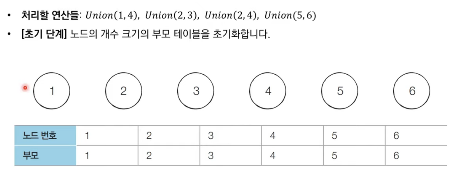 - 루트 노드가 서로 다르다면 두 노드에 대하여 합집합 연산을 수행한다.