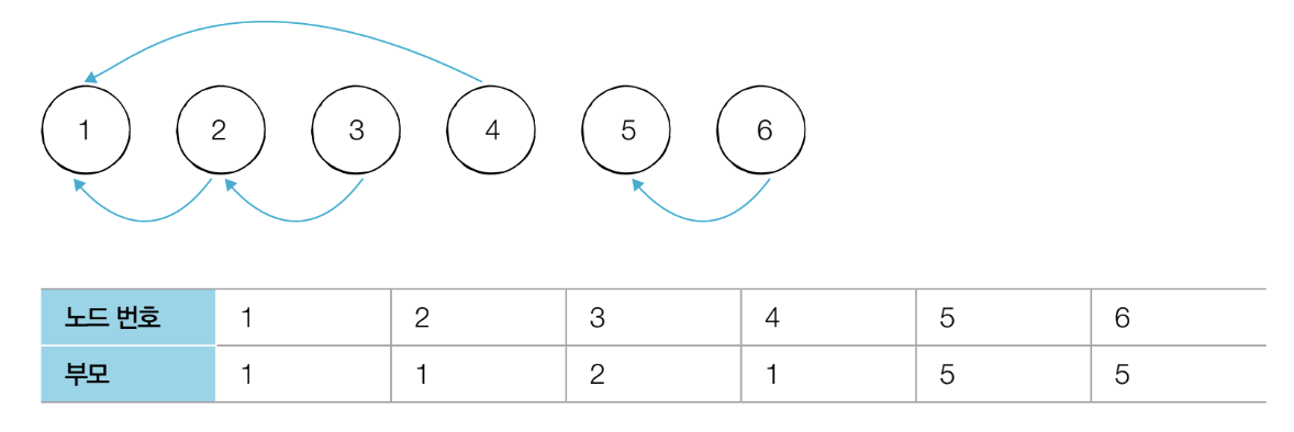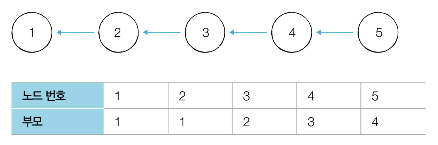 - 하지만 실제 부모노드 테이블에 담겨있는 값은 1, 1, 2, 3, 4이며, 노드 5의 루트노드를 찾으려면 5번 ~ 1번 노드까지 순회해야한다.