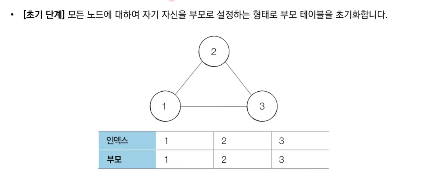 - 각 간선을 하나씩 확인하며 두 노드의 루트 노드를 확인한다.